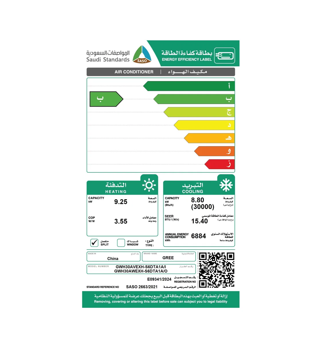 مكيف جري اسبليت جداري، اي بلس، حار بارد، قدارة 24000 وحدةGWH24AVDXE-S6DTA1B